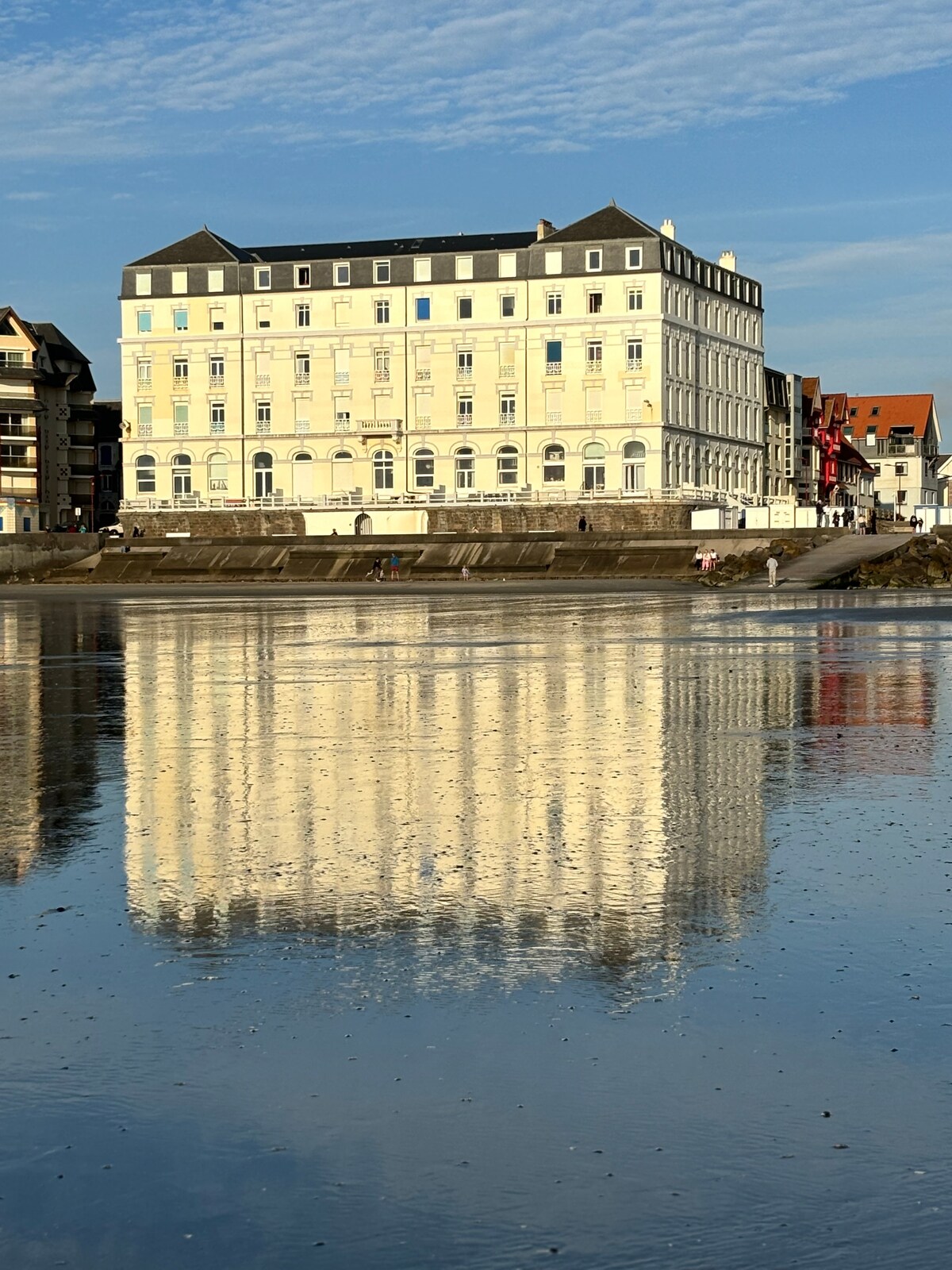 In the former Grand Hotel that made the reputation of Wimereux, 37 m2 beachfront apartment, very bright south-facing, with 3 double French windows with sea view; beautiful bedroom with cozy king size bed, living room with large very comfortable sofa, small well-equipped kitchen, easily accessible bathtub and wall-mounted toilet, parking spaces in the neighborhood. 5-minute walk to shops, 2 steps to restaurants on the dike, sailing club 150 m away, golf.