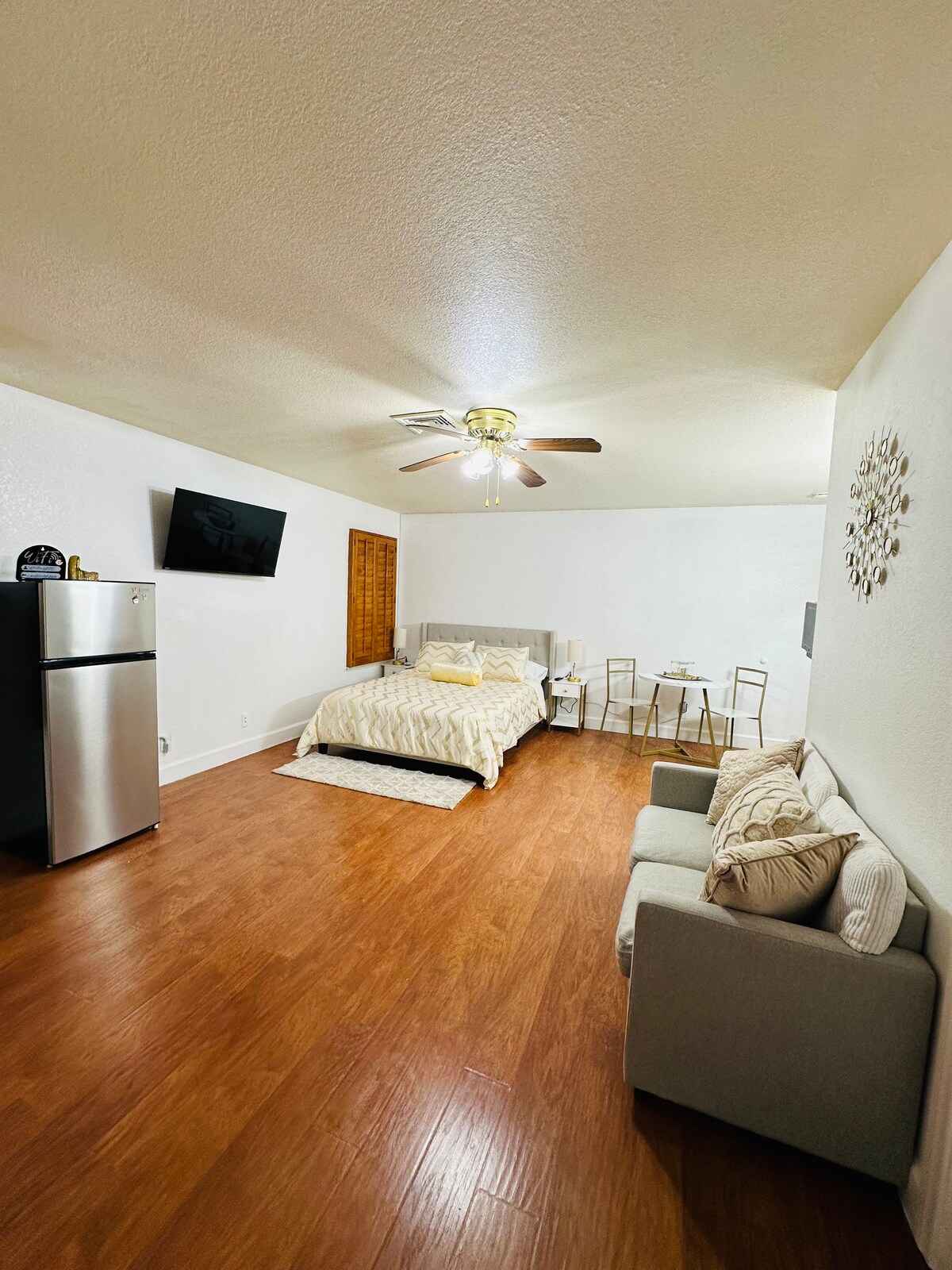 Completely Private, Large Studio Robust and equiped kitchenette, super comfortable bed, fast and reliable wifi, completely new bathroom and shower, private patio and yard. Private gated parking and secluded entrance. No contact with host unless requested *Sorry, no pets. I have a pet who uses adjacent areas *Outside smoking only *Rate is 1 person, extra guest is $20/night