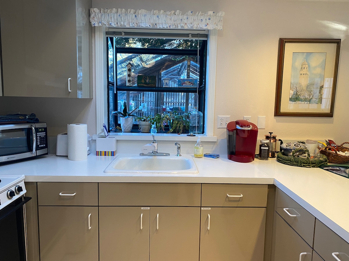 Come and relax in our light and airy studio cottage situated in a beautiful garden setting, the perfect get-away after a day of business meetings or visiting with family. We are close to major Silicon Valley destinations as well as Stanford Hospital, 45 minutes' drive from San Francisco, San Jose and the beach in Half Moon Bay — easy access to Highways 101 and 280. Our quiet neighborhood full of mature oak trees beckons you to take a walk.