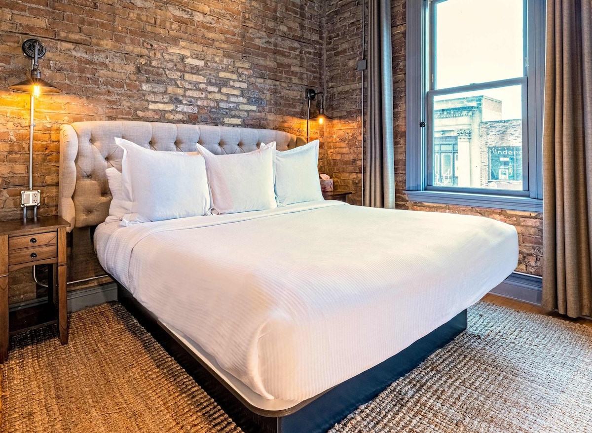 124 Lofts is a boutique collection of modern, design-forward lofts set within a beautifully restored historic building in downtown West Dundee. This listing is for Loft #1, a one-bedroom space featuring exposed brick, timber ceilings, and clean finishes that feel both character-driven and easy to enjoy. Each loft includes a king bed, private bath, kitchenette, fast Wi-Fi, and a 60" smart TV, just steps from restaurants, shops, and the Fox River.