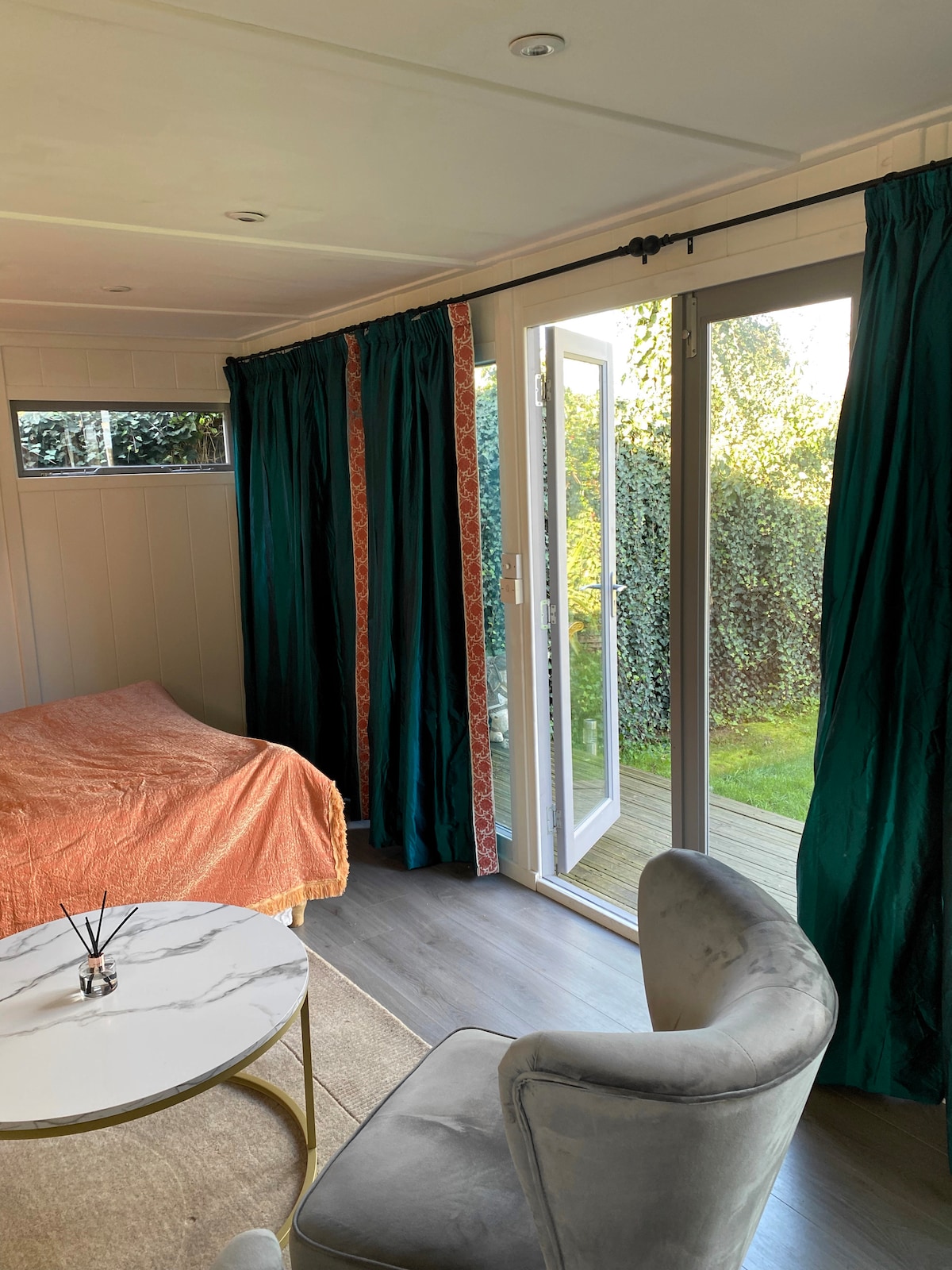 This cabin has all you need for a night, a few nights or even longer. Built in a large garden, it is quiet and secluded, not overlooked as it backs onto park area. It has a large shower and all the usual facilities allowing for a shared area along with the bed. The double doors look out onto the garden, in summer a dream, in winter it is a cosy space to rest and recupperate.