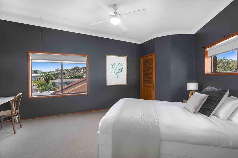Stunning Brand New Designer Beach House. 2 minute stroll to the sand. Fully fitted out, this elevated, pristine and light-filled family home captures ocean breezes and peaceful vistas. The whole top floor is a tranquil parents' retreat. The main level boasts two queen bedrooms, a bedroom for up to 5 kids, chef's kitchen, bar, family room and second deck w/BBQ. The downstairs garage doubles as a rumpus room with table tennis, bikes, home gym and separate laundry/home office.