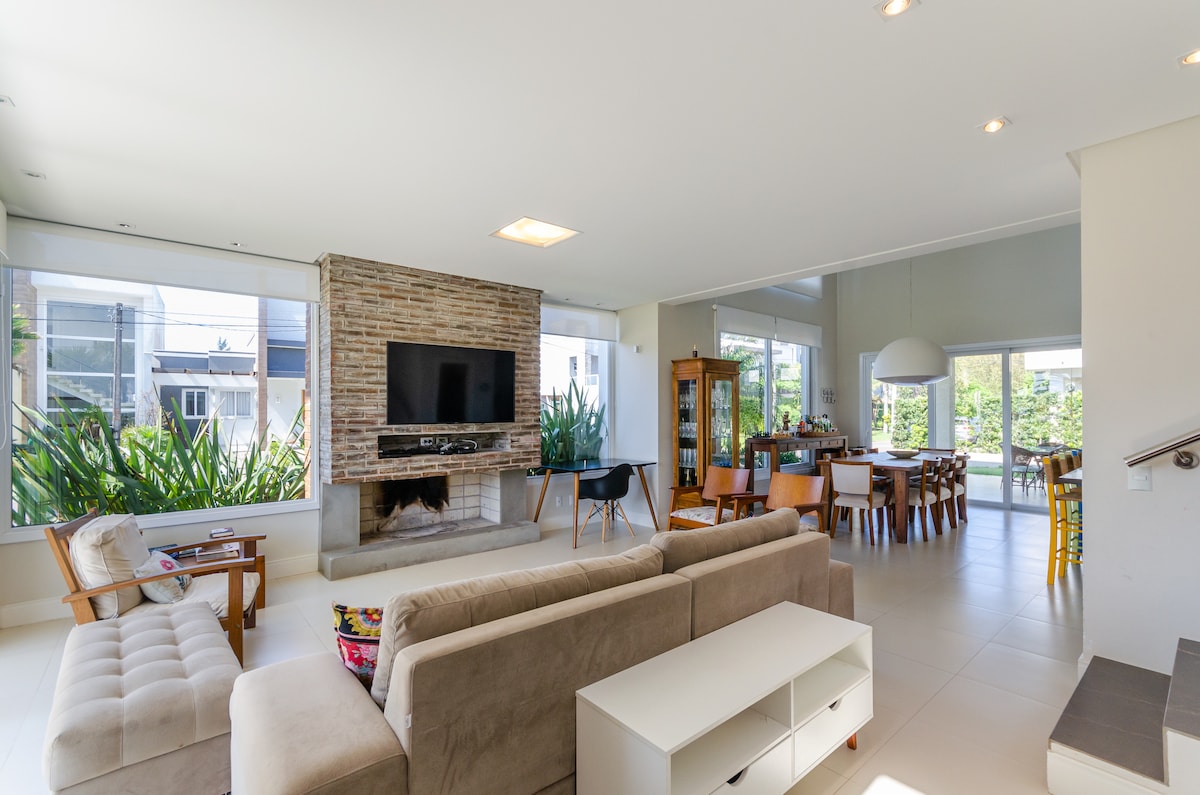 Beautiful house for couples and families in Cond. Las Palmas, Noiva-do-Mar, located in front of the main pool, large equipped kitchen, fireplace, 2 home office spaces, 750mb Wi-Fi, Claro-Net HD TV, 3 queen-bed en-suites and 1 en-suite with bunk bed and two single beds, all en-suites with air-conditioning, barbecue, private pool (4.0 x 2.0 x 1.2), pet friendly. Infra: Thermal pool, 3 tennis courts, 1 of which is covered with clay, beach tennis, padel, grass soccer, game room and lakes.