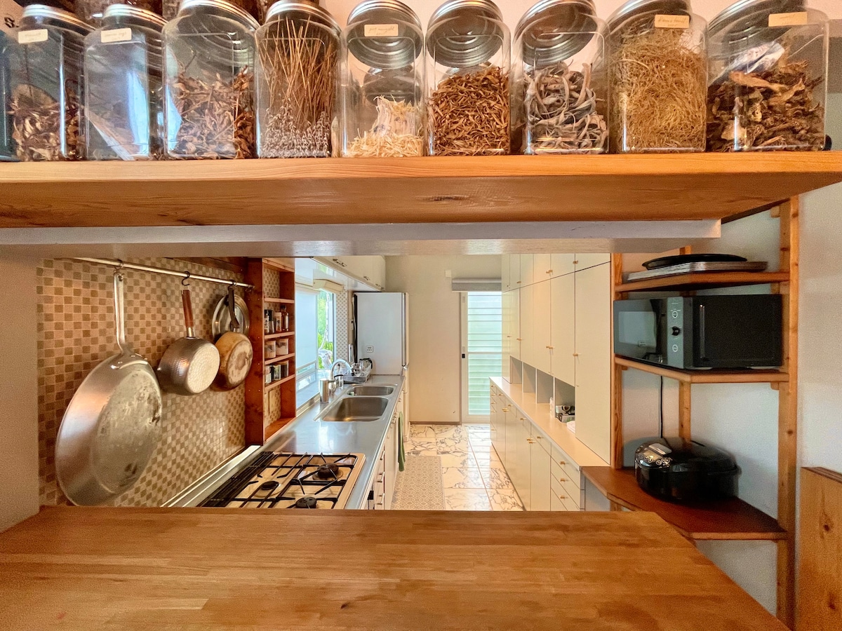 Step back in time to historic Kawasemi Cottage. Nestled in a stunning natural setting, this bright and cozy lodge celebrates retro style amidst traditional teafields. Soothed by the river below, relax in the private nostalgic bathhouse and tranquil classic garden. Or let us be your personal concierge to connect to curated outdoor & cultural activities. Order authentic bento boxes or design your own meals in the modern kitchen. Teahouse open Sat 10-4. Access by train/bus. Discount for >2 nights.