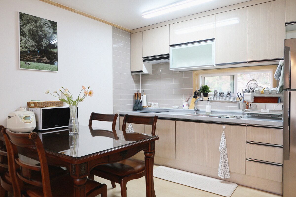 Our house is located near Taewasan, Yeongwol, Gangwon-do, and is 15 minutes by car from Cheongryongpo, Jangneung, Gosi Cave, Dongseo Garden Yeondangwon, Radio Star Museum, Photo Museum, and Byeolmaro Observatory (where you can take a shuttle). It is 25 minutes from the Korean Peninsula and 35 minutes from Youth Moon Y Park. Families with children can accommodate up to 4 people and up to 3 adults. It's a loft-style villa, and you can enjoy the indoor fireplace from autumn to spring, and you can sit in the garden in front of the accommodation and barbecue with a relaxing atmosphere. We operate two independent spaces. We welcome those who want to relax. * Free pickup service * Free barbecue service * Firewood available * Indoor fireplace is operated from October to March * EV charging available *Yeongwol-gun half-price travel accommodation (Happiness B&B)