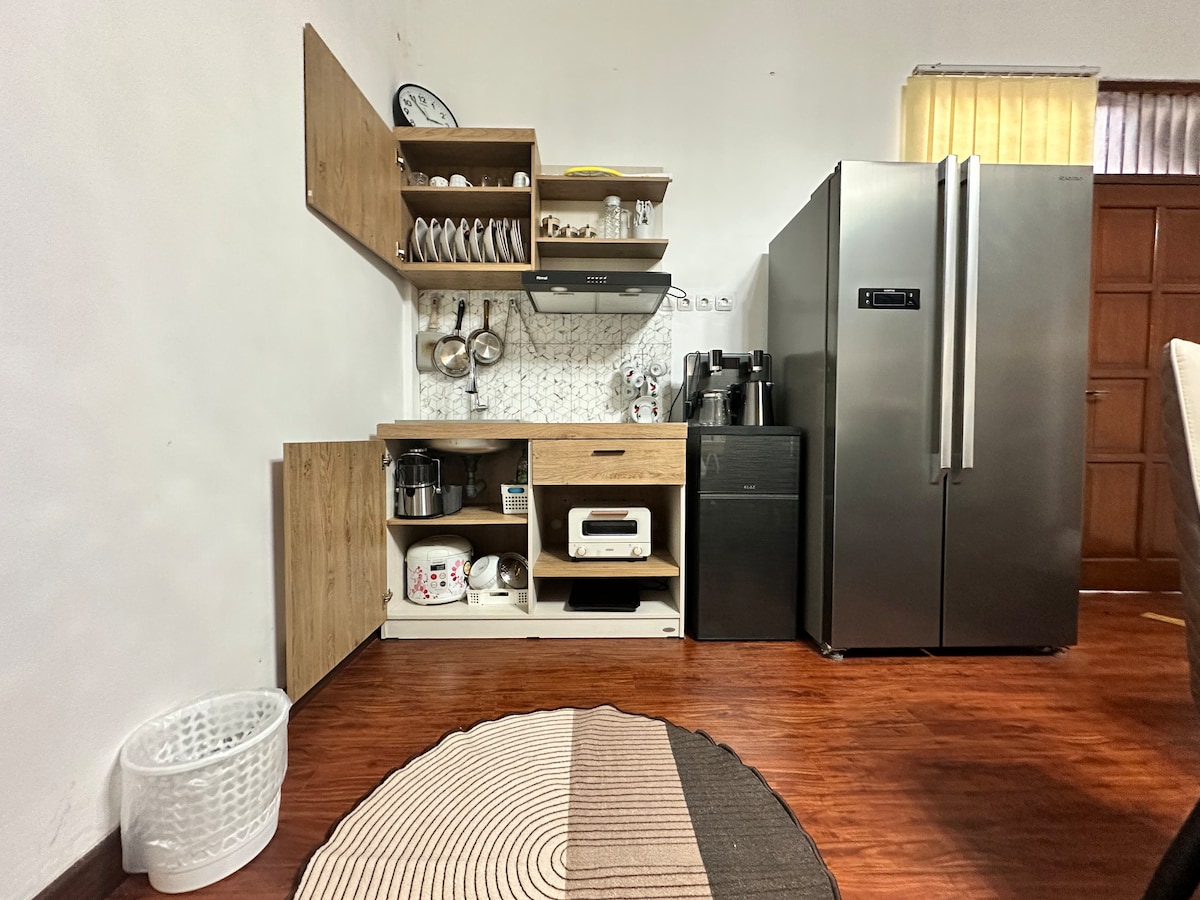 Ndalem Prabawan Private Villa is located in a quiet and comfortable area. Spacious villa with fresh air, spacious and comfortable rooms. Equipped with 2 main rooms (Queen bed, AC, water heater) and 1 extra room (single bed, fan, bathroom), family and cozy dining room. Comfort for 8 person A kitchen , including water heater, dinnerware, stove, cooking pot and pans . Washing machine and 1 bike also available for free. Parking space for 5 cars. Ndalem Prabawan, best place for vacation in Yogya