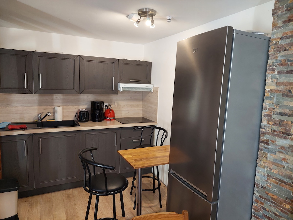 Apartment with its beautiful vaulted cellar bedroom that makes it an atypical place On the ground floor, living room, kitchen, bathroom, below, the famous bedroom.
