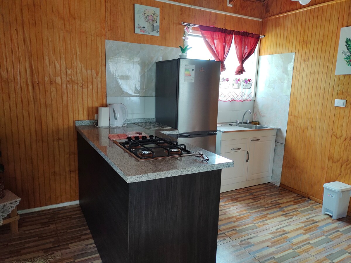 Casa acogedora de 60 m2 amoblada con 2 dormitorios, estacionamiento, calefacción a pellet, terraza y tina caliente (el valor incluye el uso de 3 a 4 horas diarias) ideal para disfrutar de un momento de relajación. Entre 5 a 10 minutos en auto para llegar a las playas. Check in: 15:00 pm Chack out: 12:00 pm Máximo 4 personas, ya sean adultos o niños. Por estar en un área residencial no se permiten fiestas en la propiedad ni ruidos fuertes desde las 00:00 am.