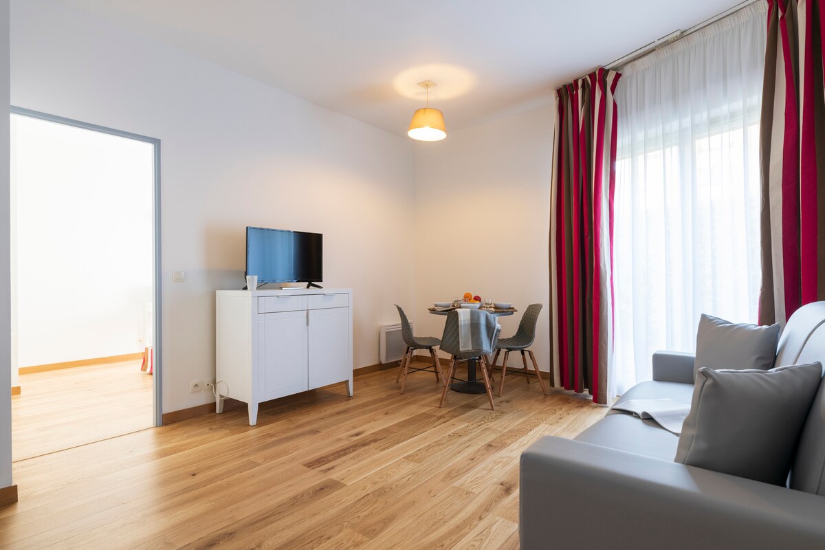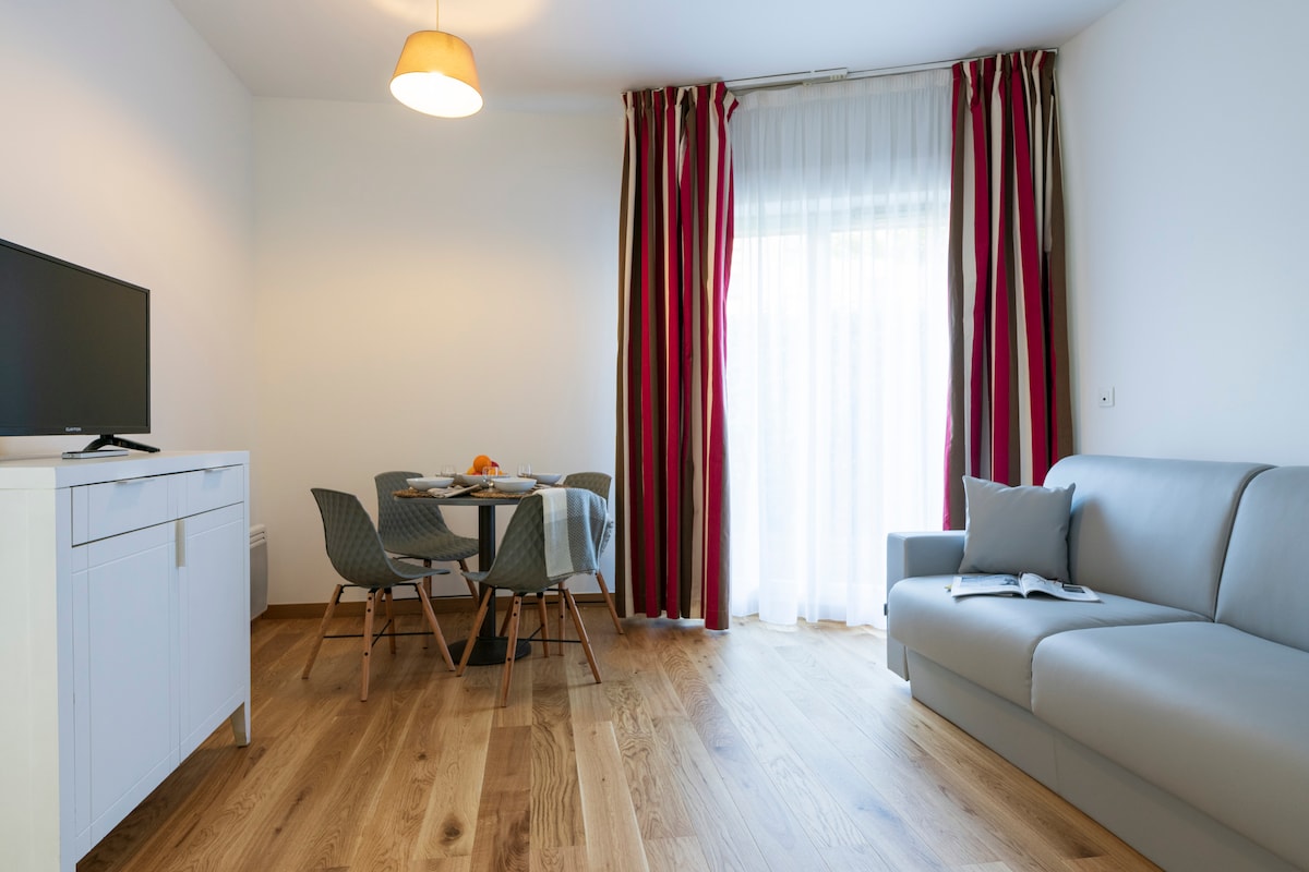 Our comfortable and practical double studios (24sqm) offer a double bed or pull-out bed depending on at conguration, air-conditioning, soundproof windows, blackout curtains, a at screen TV and a balcony in some cases. You will appreciate the kitchen corner equipped for 2 persons. You will also enjoy the work area with a phone and wireless internet. For your comfort the bathroom is equipped with a towel dryer.