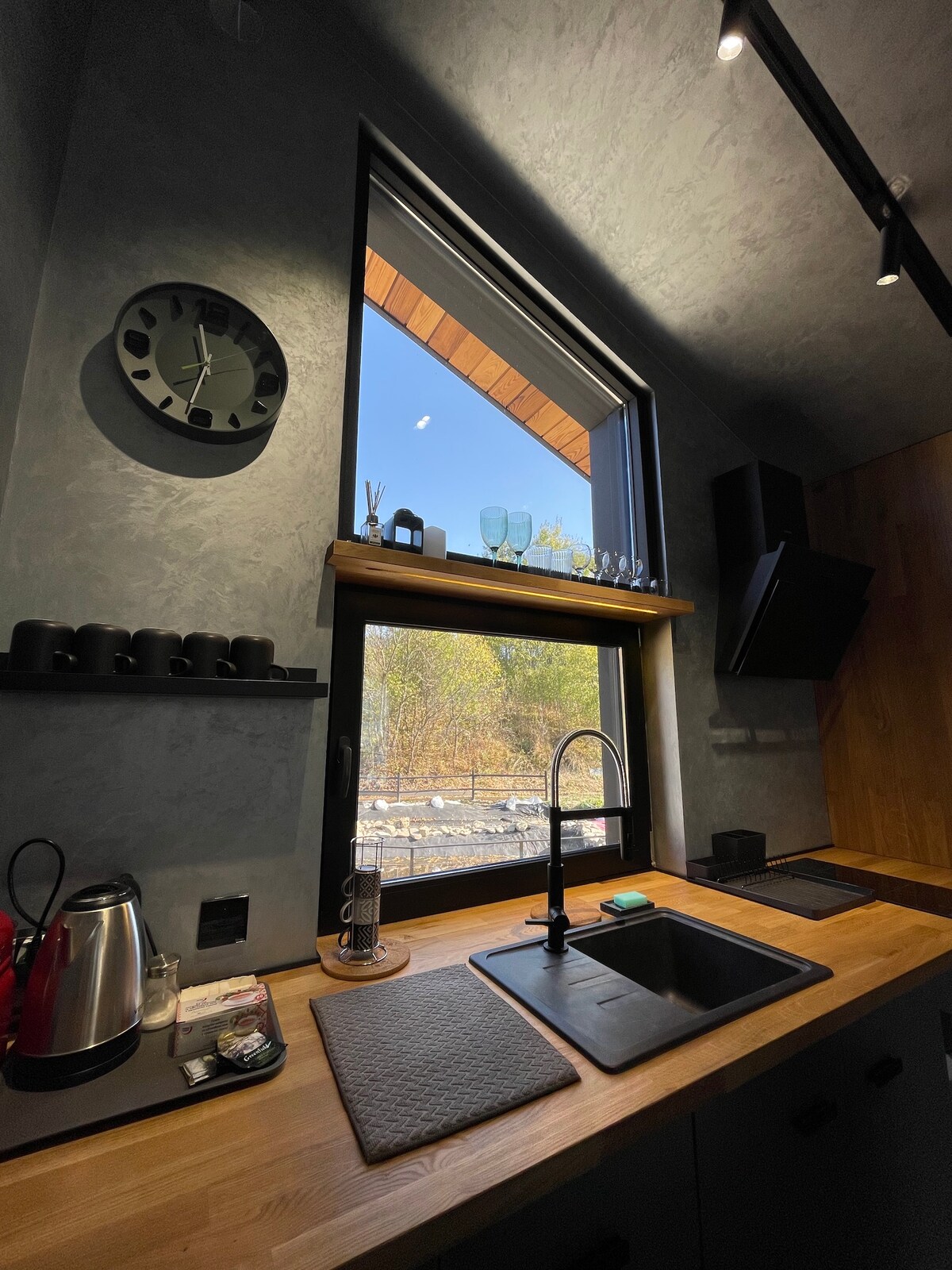 “TO YE HOUSE 2” is a one-room studio house with a niche in the attic, with a living room, and a kitchen. It is recommended for 2 people, or 2 people with children. Our house is for those who want to spend time in complete solitude and silence. Light a fireplace, wrap yourself in a blanket and under the crackling of firewood, drink hot tea, watching the snow fall on the mountains outside the window. And what incredible dawns here cannot be conveyed in words!