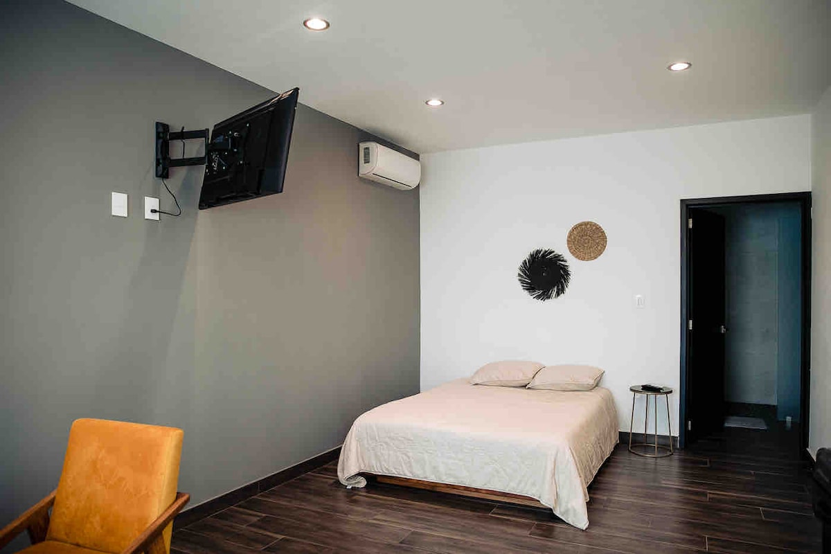 - Acogedor y exclusivo estudio ejecutivo con cama queen-size, escritorio y aire acondicionado. - Balcón para tomar aire fresco. - Cocina equipada. - Ingreso con cerradura inteligente y clave personalizada y exclusiva para cada huésped. - Rooftop panorámico con restaurante en el nivel 9. - Sala de juntas equipada para reuniones profesionales (consultar disponibilidad). - Acceso 24/7 con código personalizado. IMPORTANTE: No contamos con estacionamiento privado dentro de la propiedad.