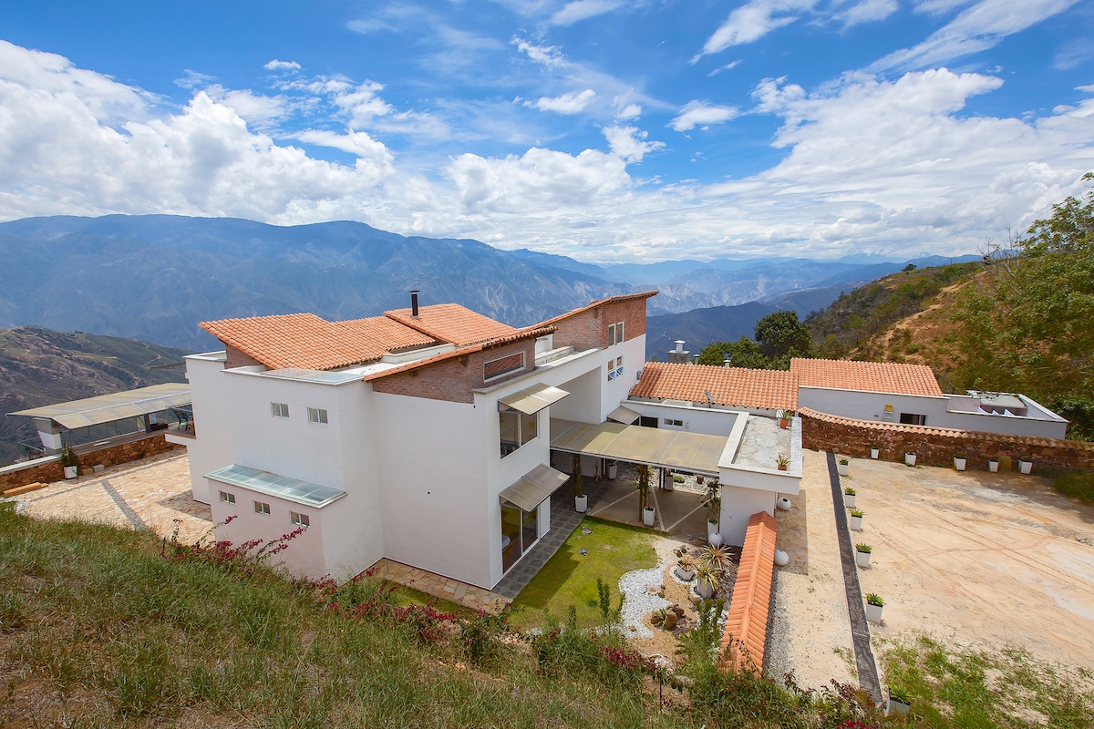 The spectacular and privileged view of the Chicamocha Canyon makes our house a unique space for family rest, ideal for disconnecting and enjoying a moment of relaxation. The space is cozy and designed to enjoy the Canyon while sharing the common spaces. We are in a rural area, so THERE IS NO DIRECT PUBLIC TRANSPORTATION TO THE PROPERTY
