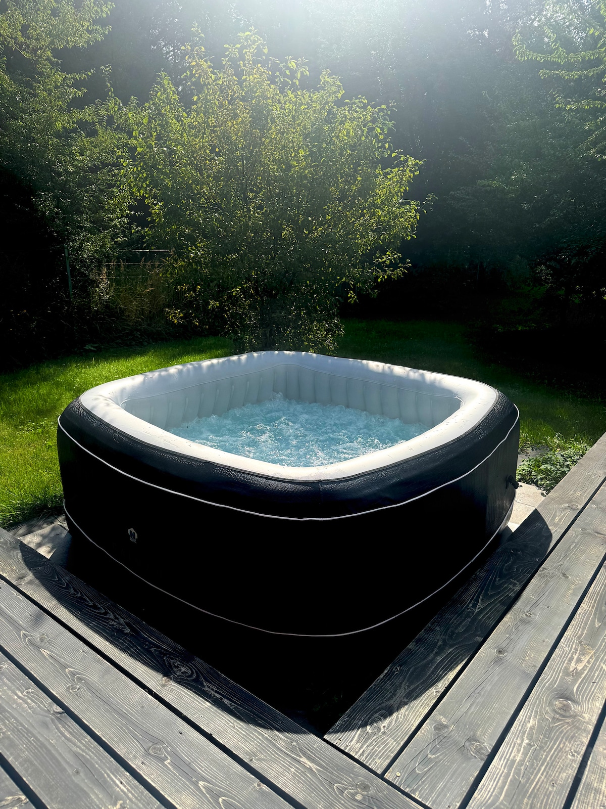 This cottage built in 2025 in American style is really special. It is located directly on a pond in which, in addition to koi carp, many birds are active. The toilet-shower building is right next to it but is a separate building, which is nice if you are with several guests. Shower water is electrically heated. Heating and cooling are provided by a heat pump. The large panoramic window offers not only a magnificent view of the pond but also the countryside around it.