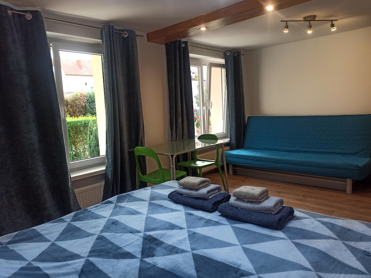 Komfortowy, ciepły i jasny pokój na parterze domku jednorodzinnego. Łazienka w korytarzu na wyłączność. Kuchnia na wyłączność. W budynku zainstalowany jest filtr solny dzięki czemu bieżąca woda jest miękka i super czysta! Budynek znajduje się w zacisznym miejscu, w "ślepej" uliczce, otoczony domkami i drzewami. Posesja jest ogrodzona, furtka zamykana na klucz. Blisko do plaży i do centrum miasta. W pobliżu droga rowerowa prowadząca do plaży i do granicy.