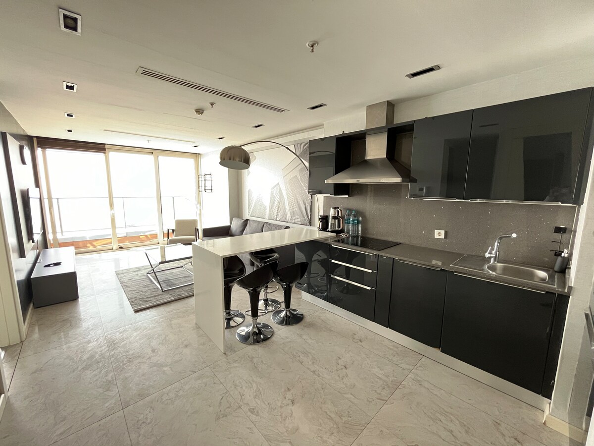 Luxury suite residence. Our apartment has a jacuzzi on the balcony Our customers can easily use the hotel facilities. Pool, gym, sauna are extra charge. The apartment has a separate parking lot and it is free The place is directly on the beach and has a uniquely beautiful sea view. The metro is within walking distance This apartment has an extraordinary sea view where you can enjoy the sunset from your sofa and bedroom