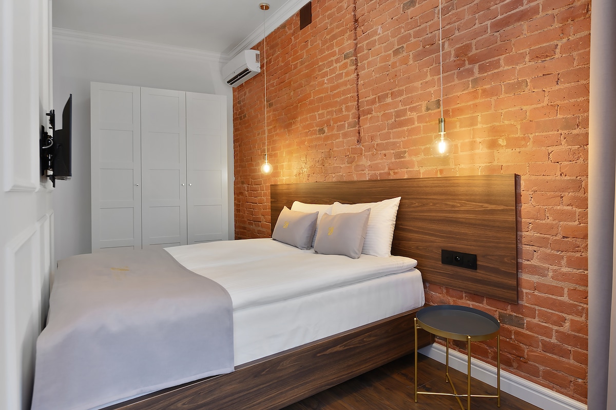 Luxurious 44 m² privacy in the heart of Łódź with a 4m high ceiling and floor heating. Designed for business trips, romantic getaways, and longer stays. Private entrance in the courtyard. - Loft bed with award-winning mattress (140 × 200) and blackout curtains. - Large, cozy sofa and work desk. - Induction hob, microwave, dishwasher, and quality kitchenware for dining. - Walk-in shower, and a separate toilet. Located near Piotrkowska Street and within walking distance of all attractions.