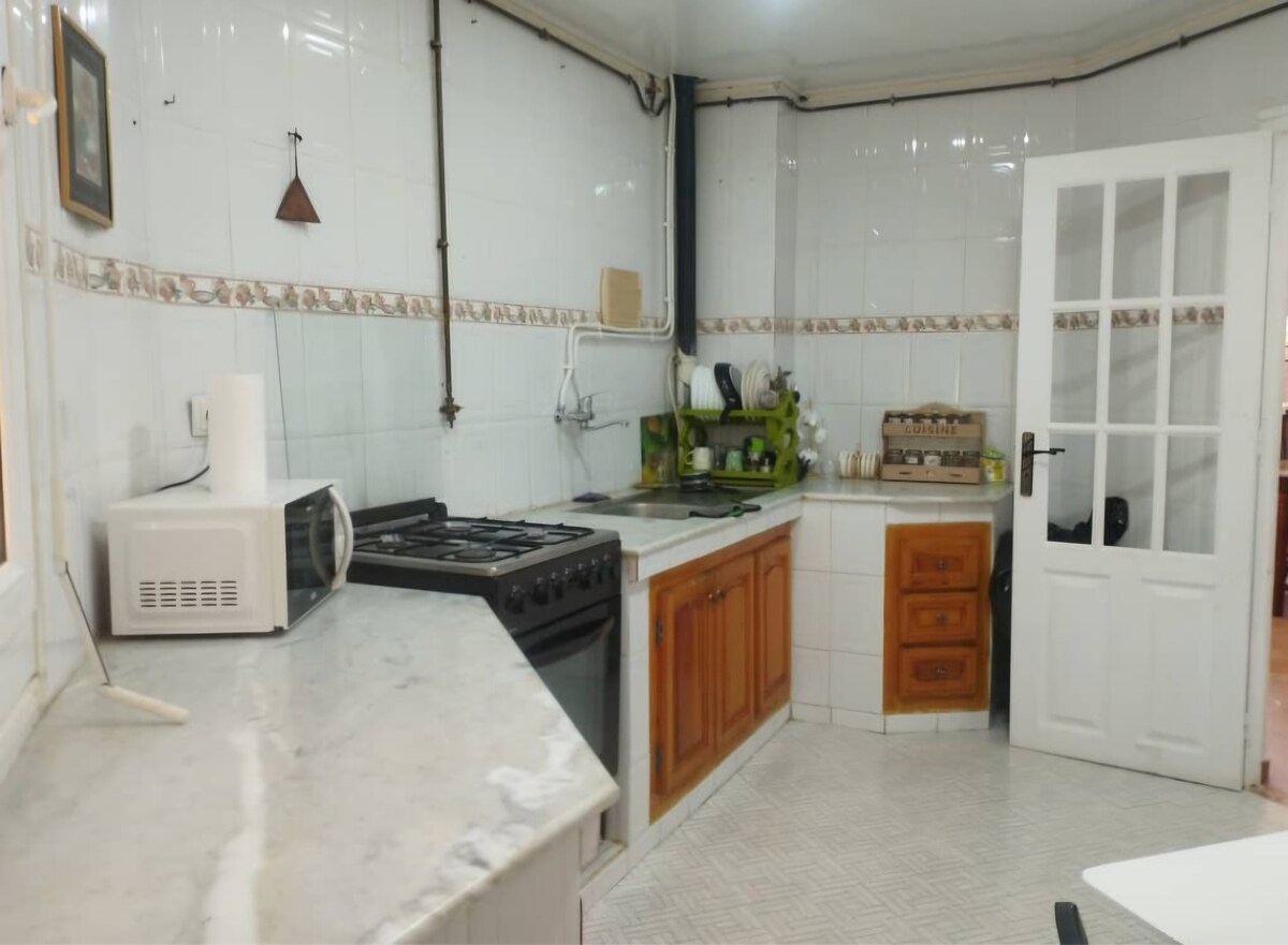 -APPARTEMENT au rez-de-chaussée surélevé au quartier "camp chevalier" a Jijel -8 COUCHAGES, 1 lit double, 2 lits simples, les 2 "lits" au salon peuvent être changé le soir pour pouvoir dormir dessus, +2 matelas en plus si besoin -PARKING en face -WIFI INTERNET -ÉLECTRONIQUE micro onde, four, plaque cuisson, grille pain, bouilloire, machine à café , machine à laver, sèche cheveux 2 clims ... -LA PLAGE a 5 - 10 minutes en voiture -Proche de la ville et de toute commodité