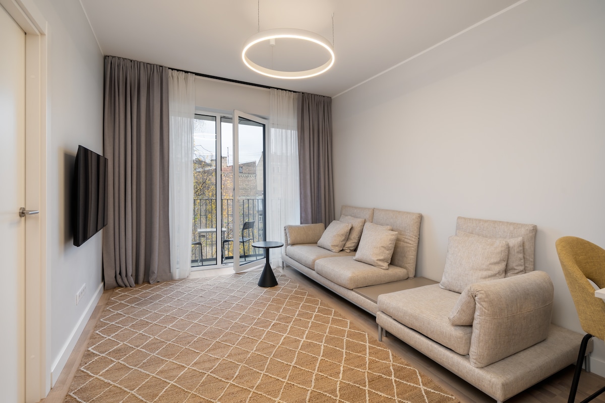 New! Cozy studio apartment - walking distance to everything you may need. King size bed (200x200) with high quality mattress. Also - a single sofa chair, for the third guest. Apartment is located in a renovated building on one of the main streets of Riga. Brand new furniture and appliances. Modern interior. 5 minute distance from Old town, central station. The National Opera, theatres, museums, exhibition galleries, concert halls are all within short walking distance.