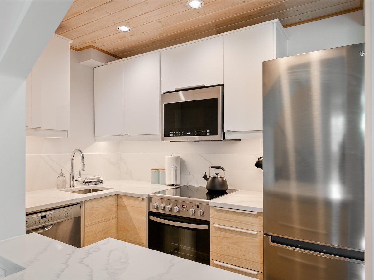 Welcome to your mountain oasis. A 1 min walk from the Blackcomb lift! Our modern condo is a bright, spacious 1 bedroom with wrap around windows for perfect tree-lined and mountain views. Look right up Whistler mountain while sipping coffee from your kitchen table! The suite has it all: - king bed - sofa bed - full kitchen including a new dishwasher - soaker jet tub - Keurig - Bose speaker - central A/C - upgraded July 2025 The building has a gym, laundry, pool and outdoor hot tub.