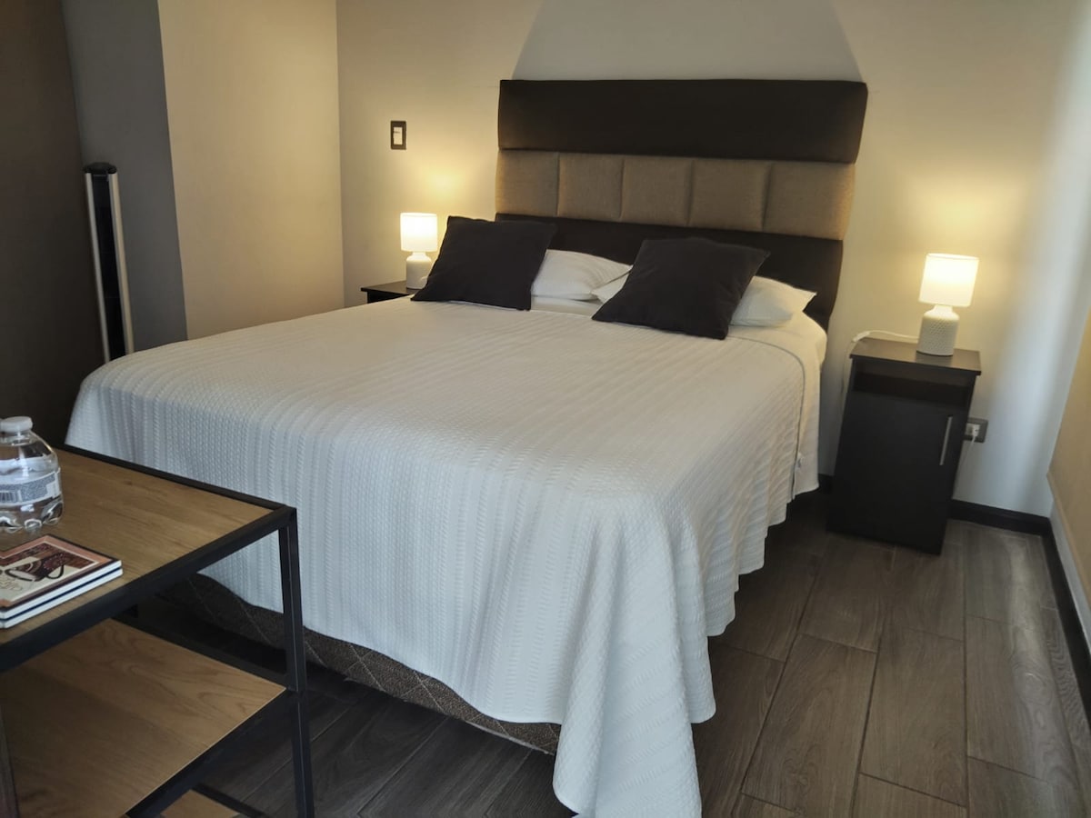 Centrally located, private, clean apartment overlooking the volcanoes in zone 10. This apartment features: - Jacuzzi -Pool - Gym -New, high-quality orthopedic bed - A silent fan -Equipped kitchen -Hair dryer -Smart HD TV and excellent internet speed. It has private parking, walking access, multiple shopping malls, squares, cafes, bookstores, bike paths and nightlife nearby. Located in Guatemala City's hotel area.