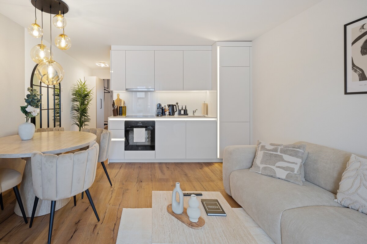 Enjoy a stylish experieExperience urban comfort in a stylish, fully furnished new-build apartment with a fully equipped kitchen. Ideally located just minutes from Zurich, Oerlikon, and the airport. Enjoy the perfect mix of city life and top infrastructure—supermarkets, restaurants, and public transport right at your doorstep. Premium amenities, including a rooftop terrace ensure a relaxing and productive stay.nce at this centrally-located place.