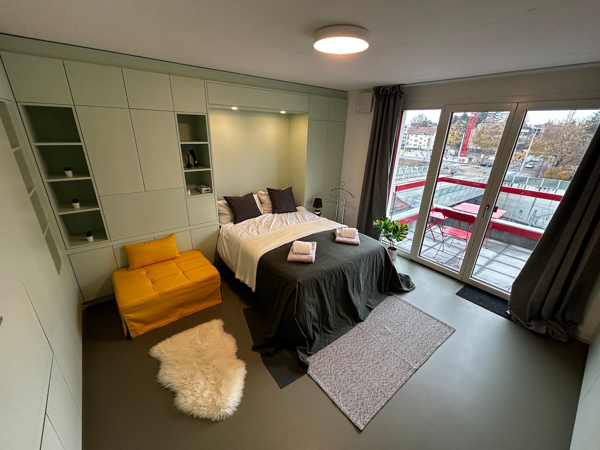 HOME PRISKA – Holidays / work in Baar/Zug, including parking Newer ground-floor one-room flat. Own electric vehicle charging station. Private entrance via a small, ground-level terrace. Apartment: 35 m². Separable sleeping area (sliding glass partition), modern bathroom with Closomat toilet, underfloor heating New kitchen (including crockery and pans) with steamer, dishwasher, fridge, ceramic hob and coffee machine, including coffee capsules. HD TV, Wi-Fi, Swisscom TV Replay. Long car park in front of the flat. Quiet + central.